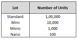 1,00,000 units = 1 lot ( standard ) 33,000 units = 0.33 lot ( standard ) 1,000 units = 0.01 lot ( standard )
