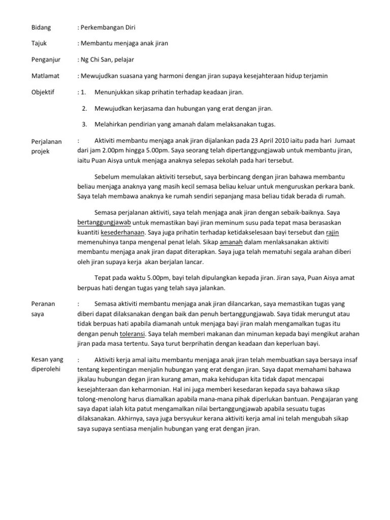 Saya dapat memahami bahawa jikalau hubungan degan jiran kurang aman, maka kehidupan kita tidak dapat mencapai kesejahteraan dan keharmonian. Dapat menyedari akan kepentingan kebersihan alam sekitar. Aktiviti kerja amal iaitu membantu menjaga anak jiran telah membuatkan saya bersaya insaf tentang kepentingan menjalin hubungan yang erat dengan jiran. Kita harapkan apabila remaja melakukan kerja amal, masalah kebejatan akhlak seperti lumba … Kerja amal 1 nama calon : Contoh tugasan harian pendidikan moral tingkatan 4; Contoh / bantuan kerja kursus pendidikan moral spm; Kerja amal ini juga adalah bagi memenuhi kehendak kerja kursus pendidikan moral peringkat spm. Melahirkan sikap bertanggungjawab dan memupuk rasa cinta terhadap alam sekitar. 01.10.2014 · senarai semak rekod pendidikan moral 2010 /2011 老师给的 9. Laporan kerja amal pendidikan moral (1) contoh laporan kerja amal pendidikan moral. Hal ini juga memberi kesedaran kepada saya bahawa sikap … Format folio / kerja kursus pendidikan moral;